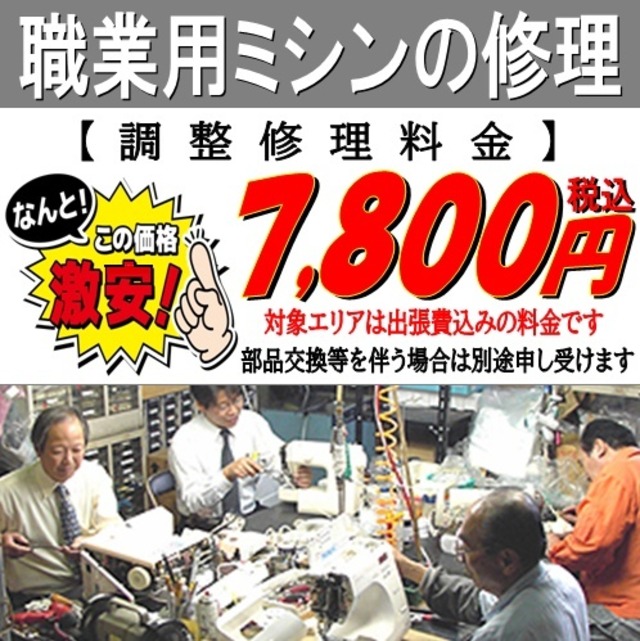 ┏★☆★☆━━━━━━━━━━━━━━━┓ あ な た の ミ シ ン の 修 理 屋 さ ん で す ┗━━━━━━━━━━━━━━━☆★☆★┛ 【 ミ シ ン 修 理 技 術 料 金 】 調 整 修 理 料 金 ⇒ 7,800円 ( 税込 )~ ※注) 部品交換を伴う場合は別途申し受けます。 ※注) 分解は修理スタッフにお尋ねください。 ※注) 修理不可能な場合は料金は頂きません。 _/_/_/_/_/_/_/_/_/_/_/_/_/_/_/ 調整修理は部品交換を伴わない修理で分解や 外装カバーの取外しを行わない簡易修理です。 ご指定のご住所へ地域担当の修理スタッフが、 迅速にお伺いして親切丁寧に調整いたします。 作業時間は最短で約30分で終了いたします。 ※注) 重度の場合はお預かり修理となります。 +++★ 早くて、安くて、安心、便利です ★+++ ◎ 部品交換などが必要な場合は、お見積りを いたしますので、ご検討された上で 部品交換を行いますのでご安心ください。 ◎ オーバーホールも別途承りますので、 詳しくは修理スタッフにお尋ねください。 _/_/_/_/_/_/_/_/_/_/_/_/_/_/_/ .